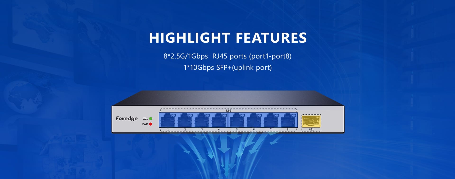 | Networking Ports | ● 8*2.5G/1Gbps RJ45 ports (port1-port8) ● 1*10Gbps SFP+(uplink port) |