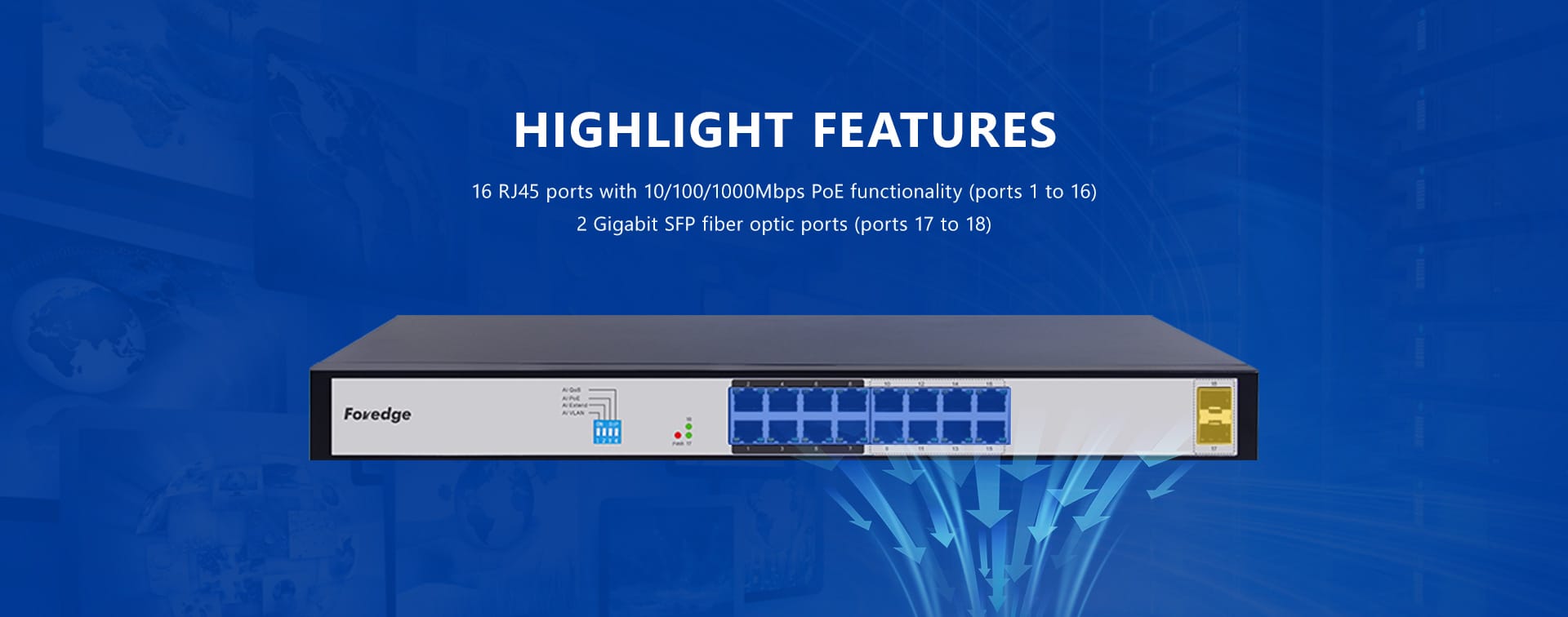 | Network Interface | ● 16 RJ45 ports with 10/100/1000Mbps PoE function (Port 1~Port 16) ● 2 gigabit SFP fiber ports (port 17~port 18) |