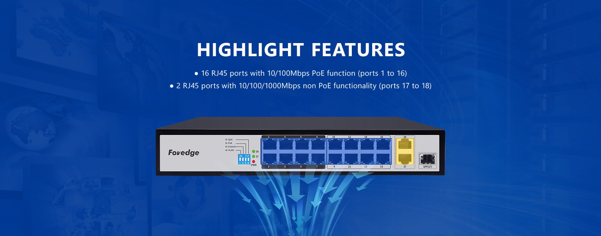 | Network Interface | ● 16 * 10/100Mbps RJ45 PoE Ports (Port 1~Port 16) ● 2 * 10/100/1000Mbps RJ45 Ports (Port 17~Port 18) ● 1 * SFP Combo Port |