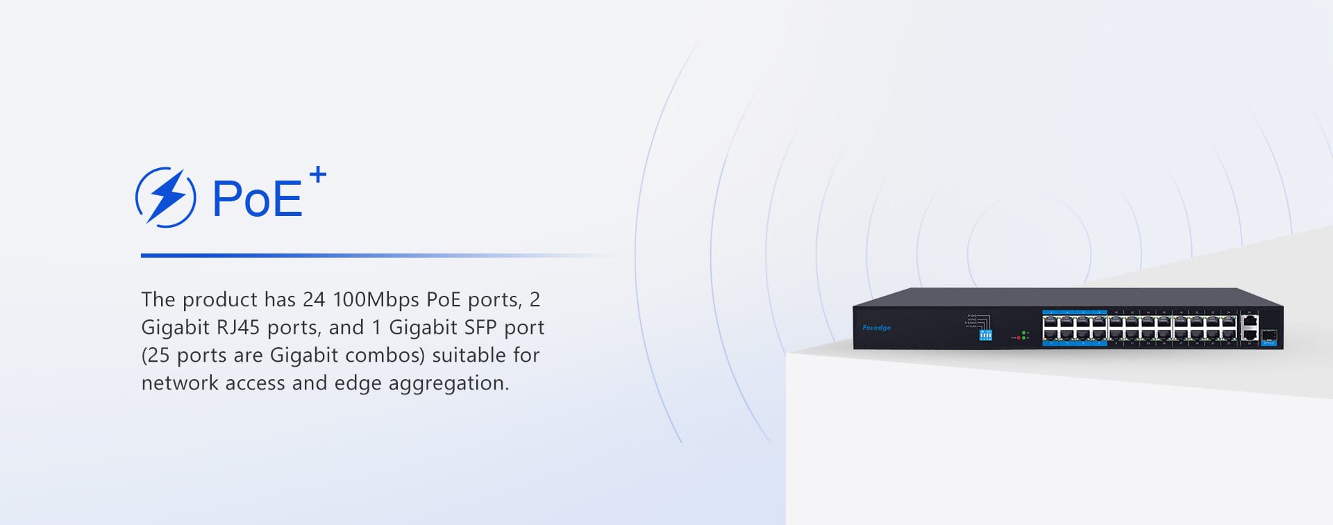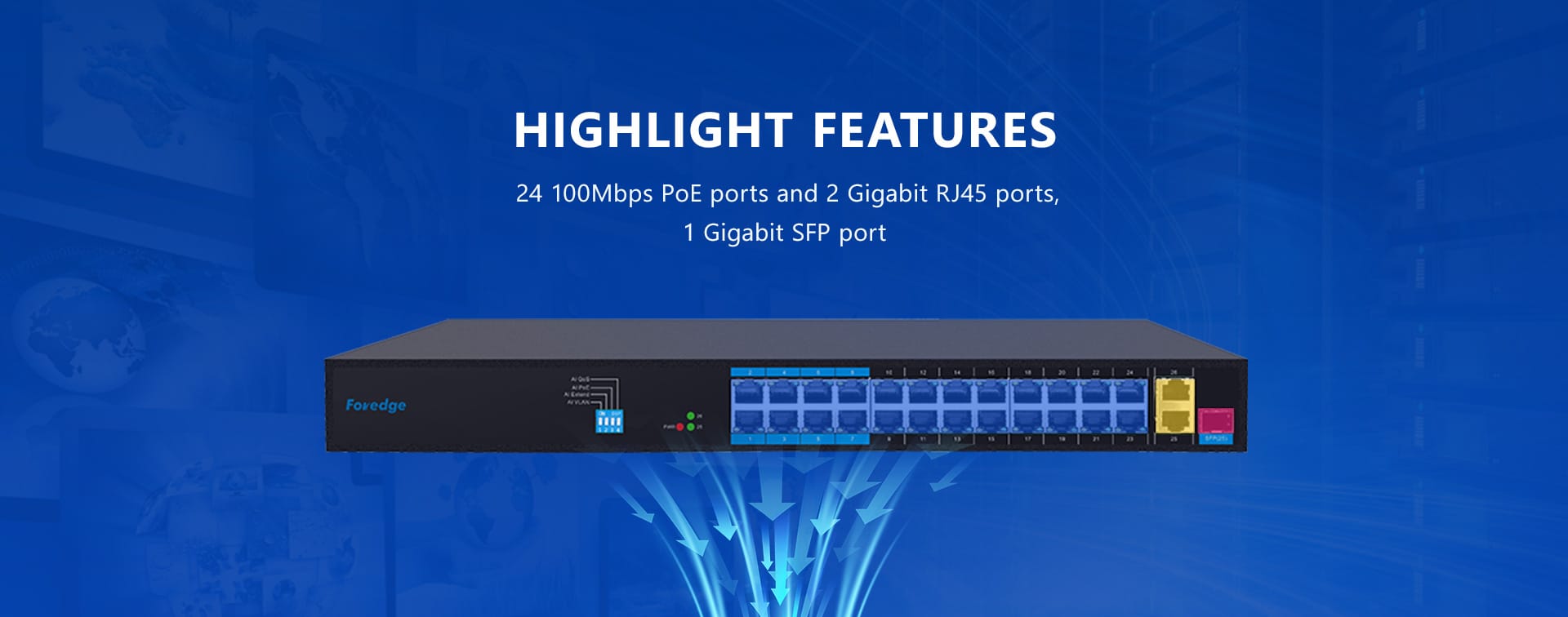 ● 24 puertos PoE de 100Mbps y 2 puertos RJ45 Gigabit, 1 puerto SFP Gigabit