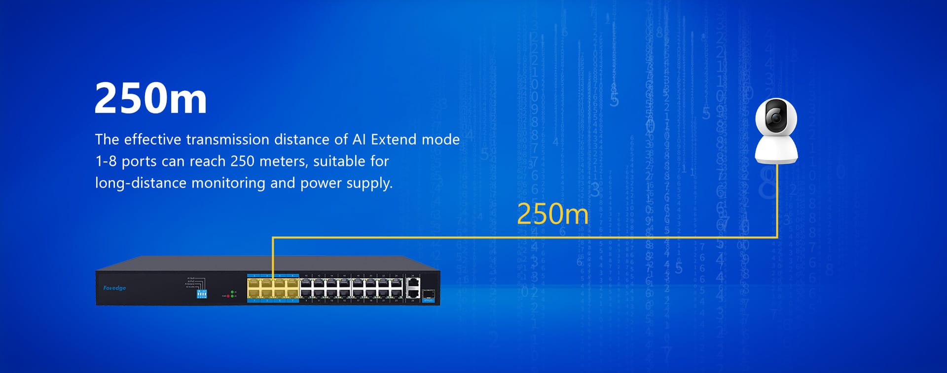 ● La distancia de transmisión efectiva de los puertos 1-8 en modo AI Extend puede alcanzar 250 metros, adecuada para monitoreo y suministro de energía a larga distancia.