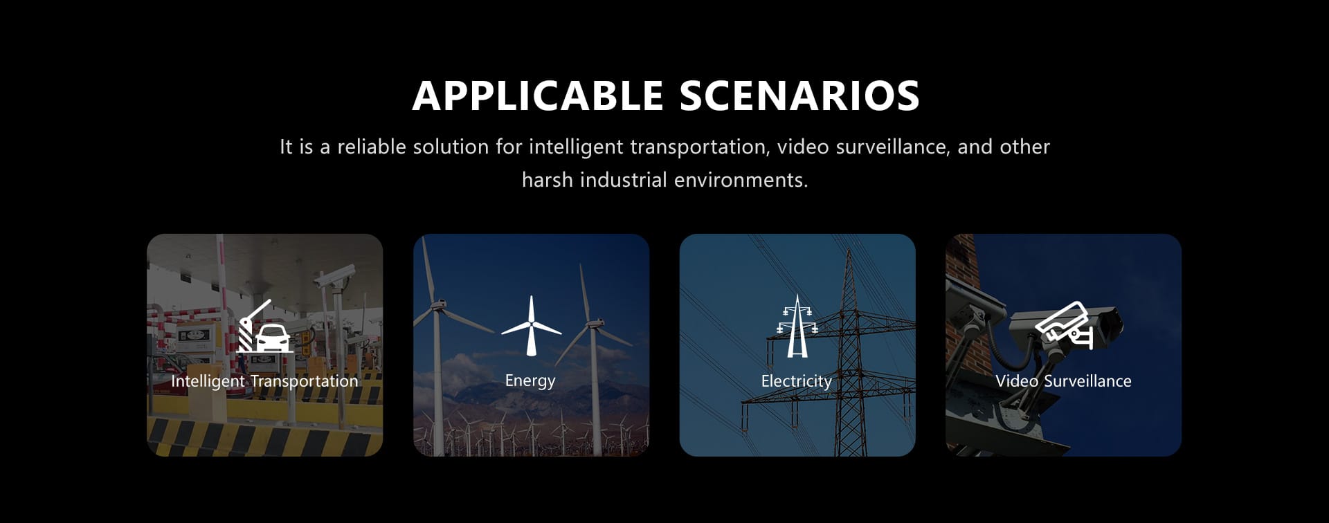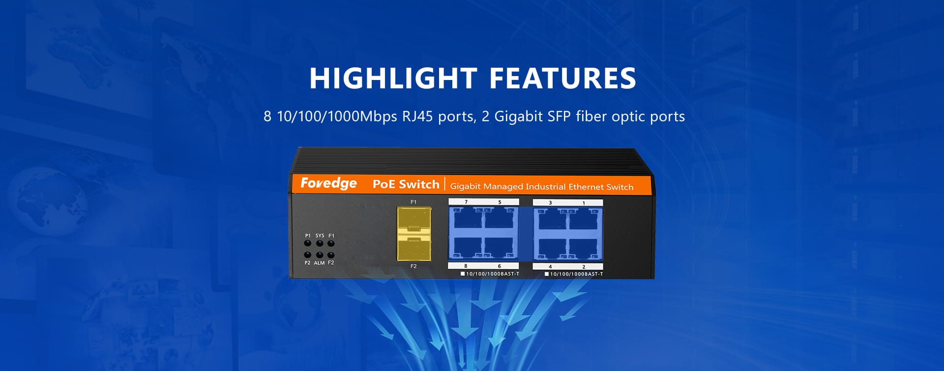 ● 8 puertos RJ45 10/100/1000Mbps (POE), 2 puertos de fibra óptica SFP Gigabit