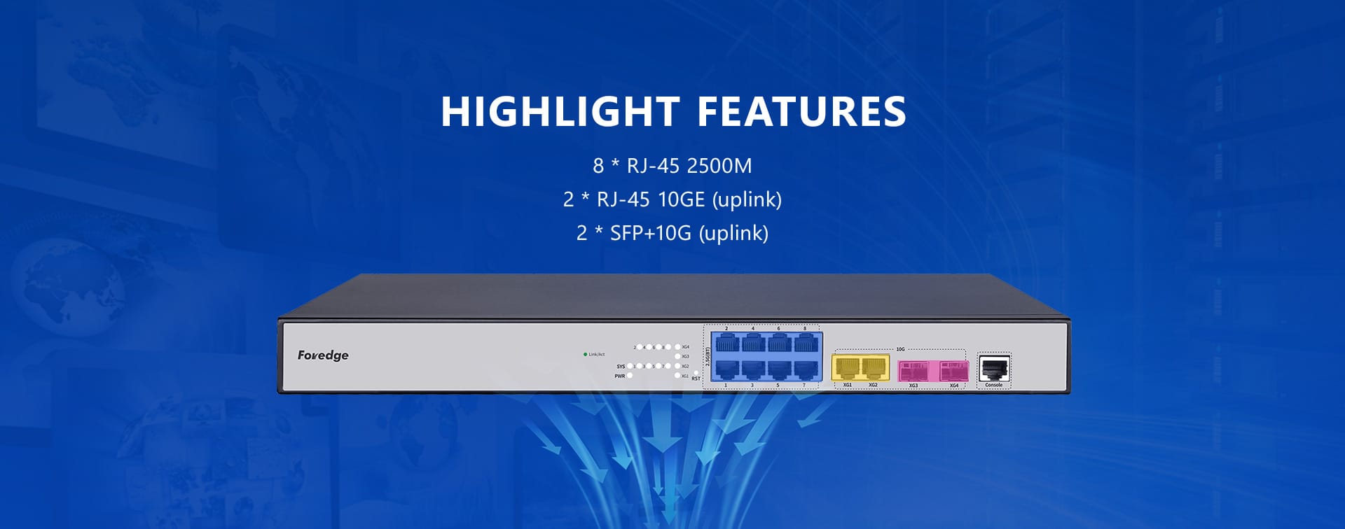 8 * RJ-45 2500M, 2 * RJ-45 10GE (enlace ascendente), 2 * SFP+10G (enlace ascendente)