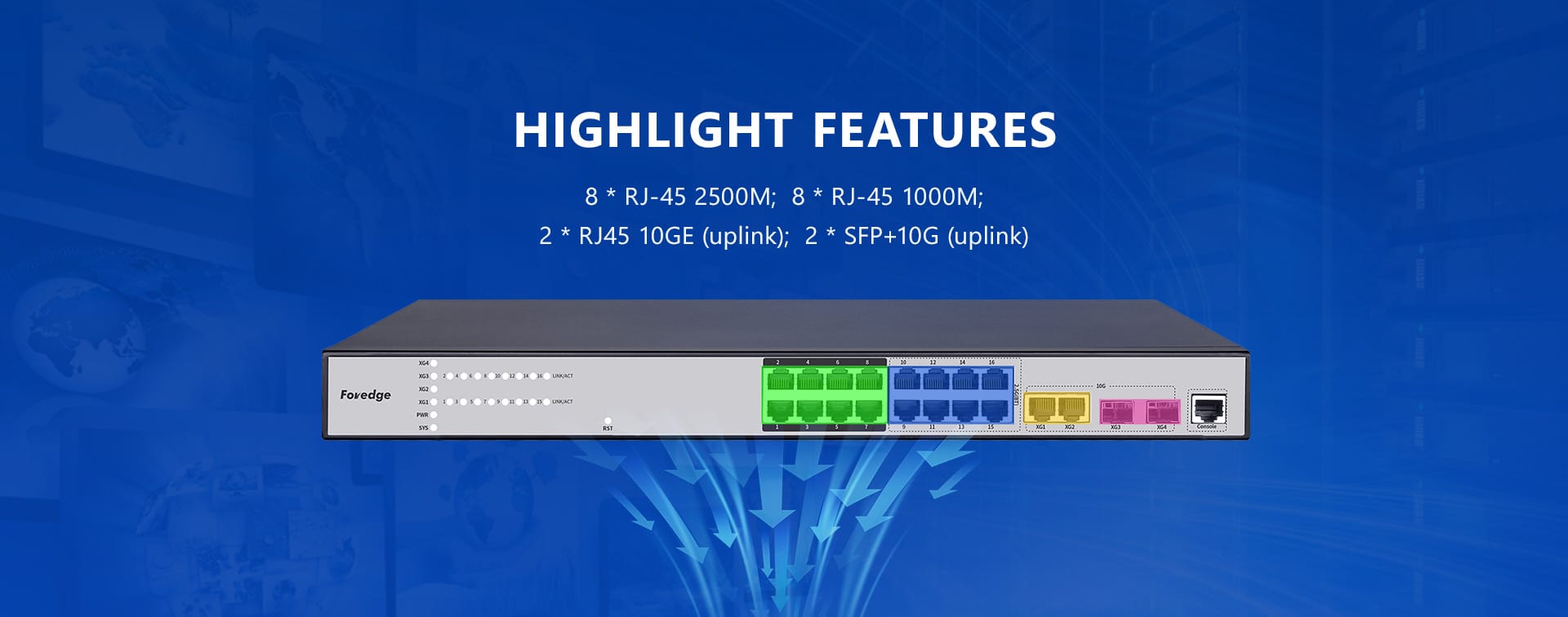| Networking Interface | ● 8*1000M/2.5G RJ45 ports ● 8*10/100/1000Mbps RJ45 ports ● 2*10G electric ports ● 2*10G SFP+ ports ● 1*Console port |