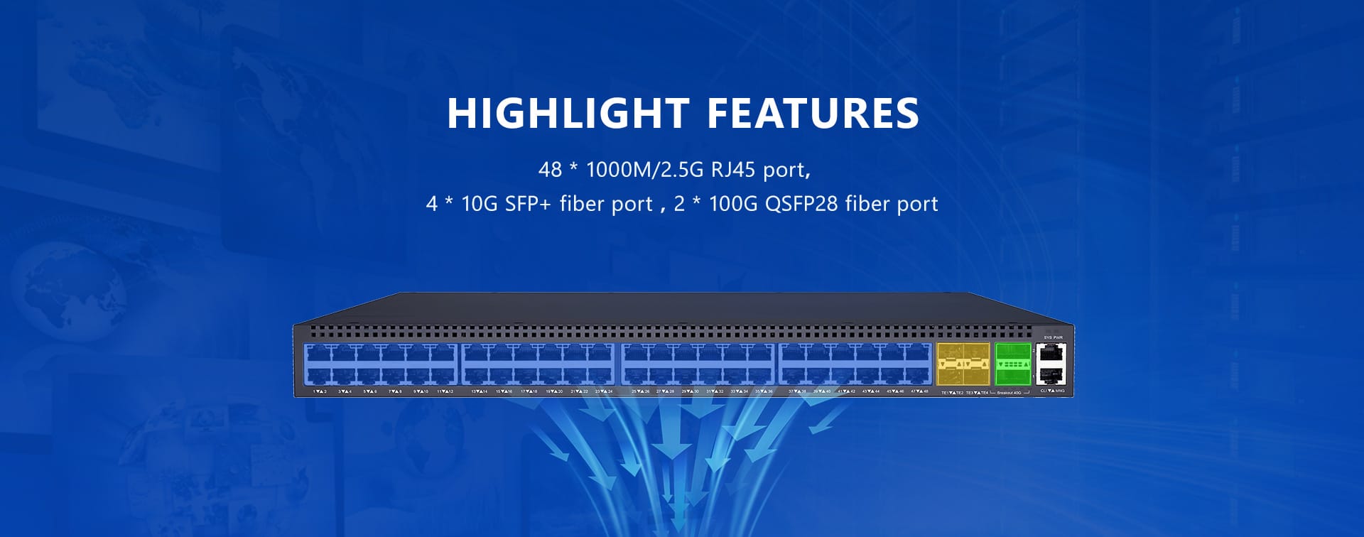 48 * puertos RJ45 1000M/2.5G, 4 * puertos de fibra SFP+ 10G, 2 * puertos de fibra QSFP28 100G