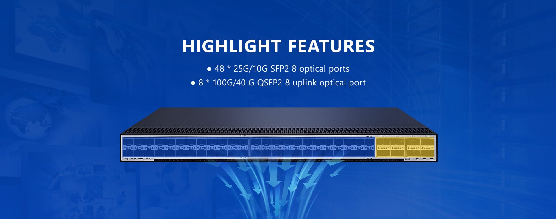 | Network Interface | ● 4 8 * 2 5 G/ 1 0 G SFP2 8 optical interfaces ● 8 * 1 0 0 G/ 4 0 G QSFP2 8 optical interfaces ● 1 * Console port ● 1 * Management port ● 1 * USB port |